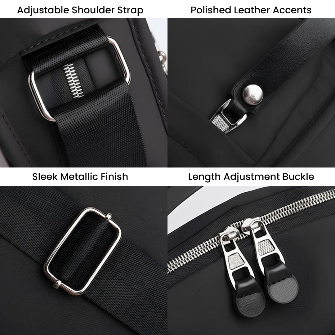 The adjustable shoulder strap lets you wear it crossbody or over the shoulder for the perfect fit. Polished leather accents and sleek metallic hardware lend durability and a hint of luxury, while the sturdy length-adjustment buckle keeps your style effortless and secure.